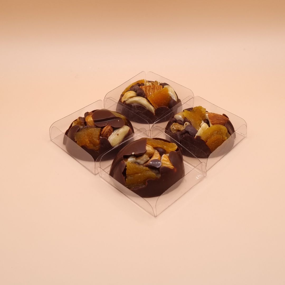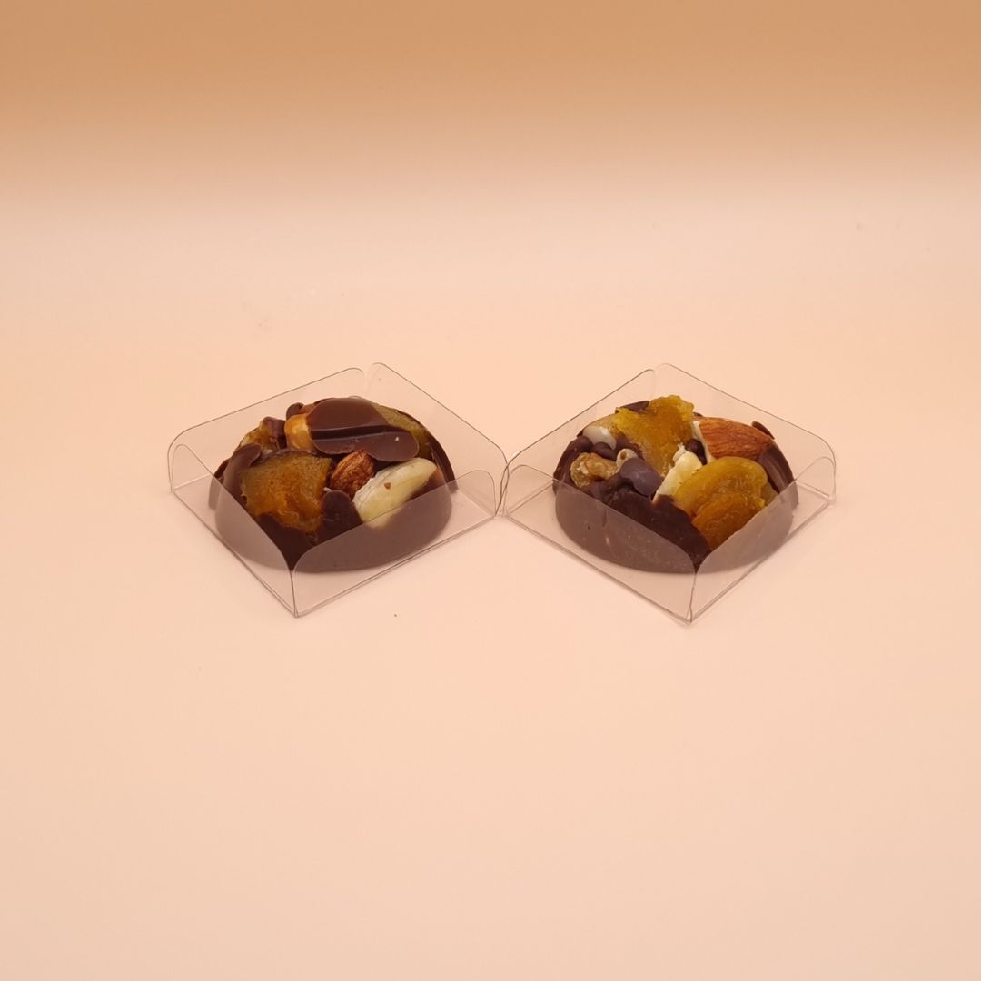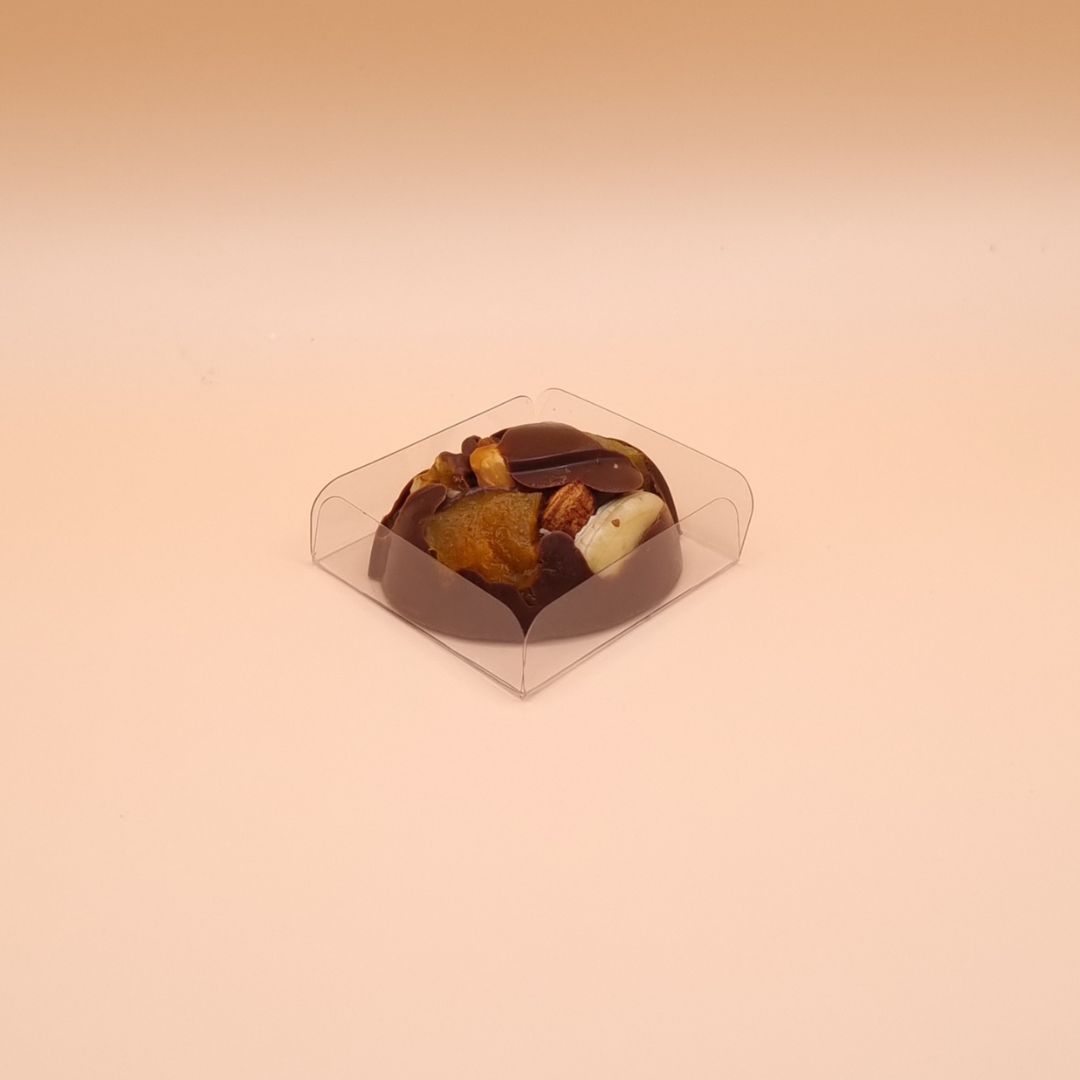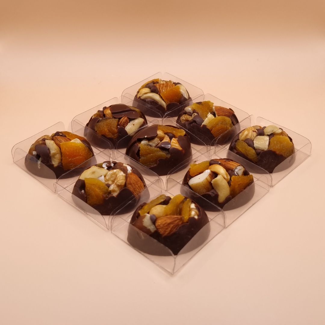 - Bombom de chocolate nobre que derrete na boca com Amêndoas, Avelã, Nozes, Castanha do Pará, Castanha de Caju e Damasco.