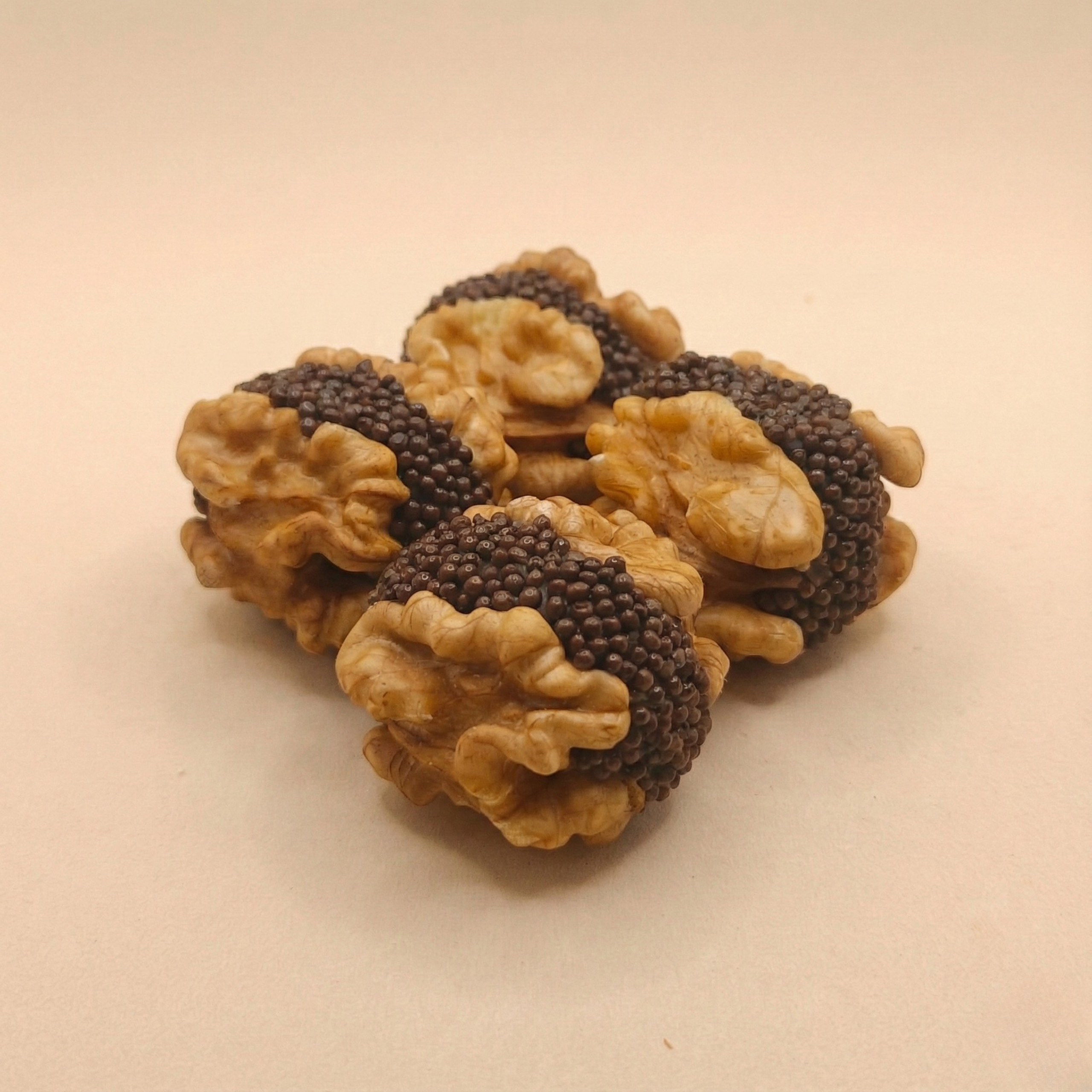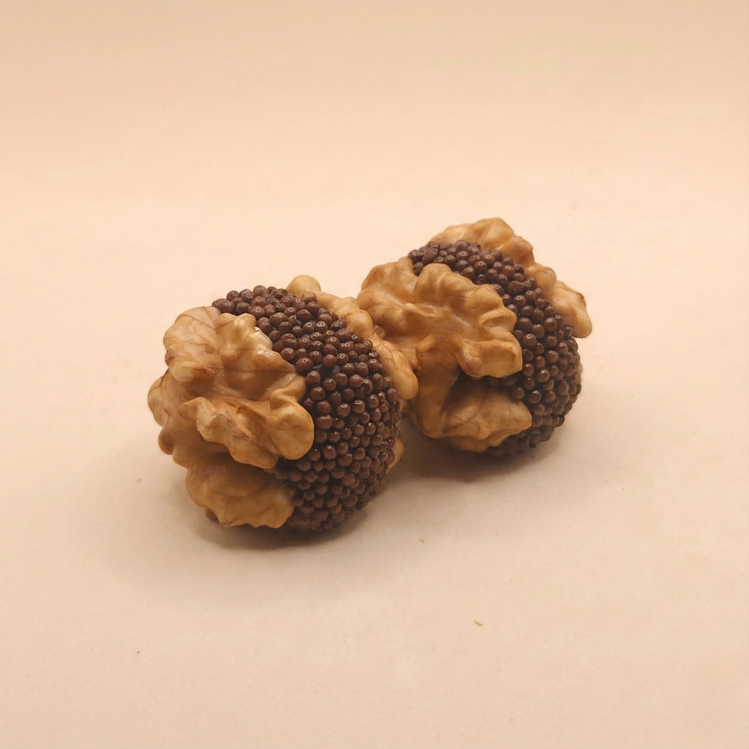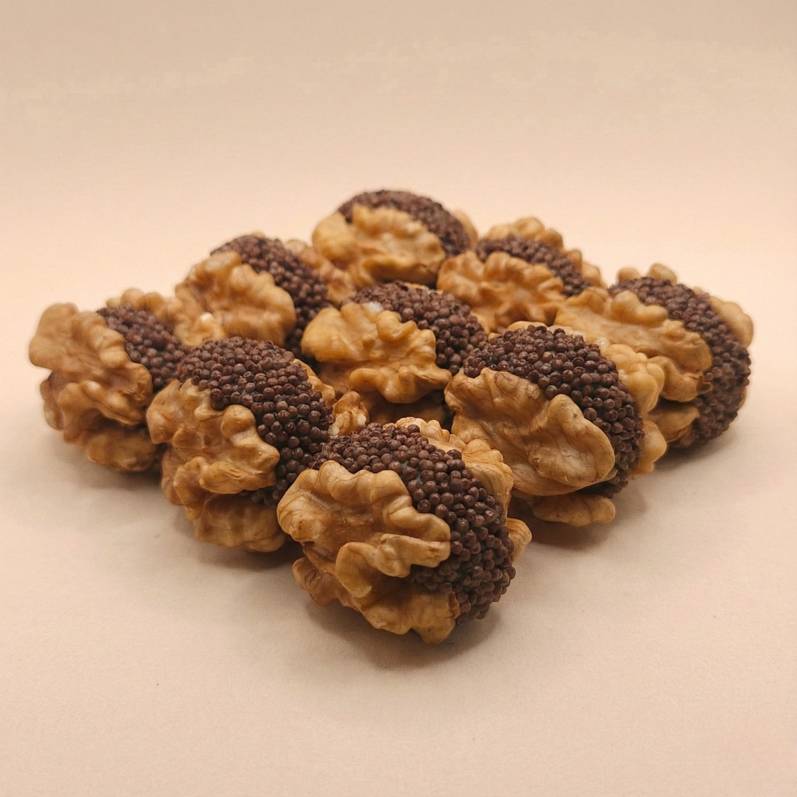 - Brigadeiro cremoso de chocolate nobre envolvido por miçangas douradas e duas nozes inteiras.