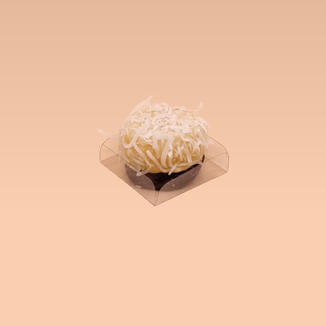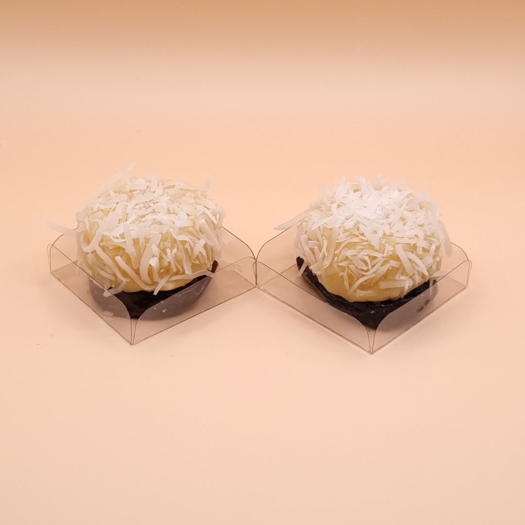 - Brigadeiro de coco finalizado com coco em flocos e, na base, uma ameixa desidratada.